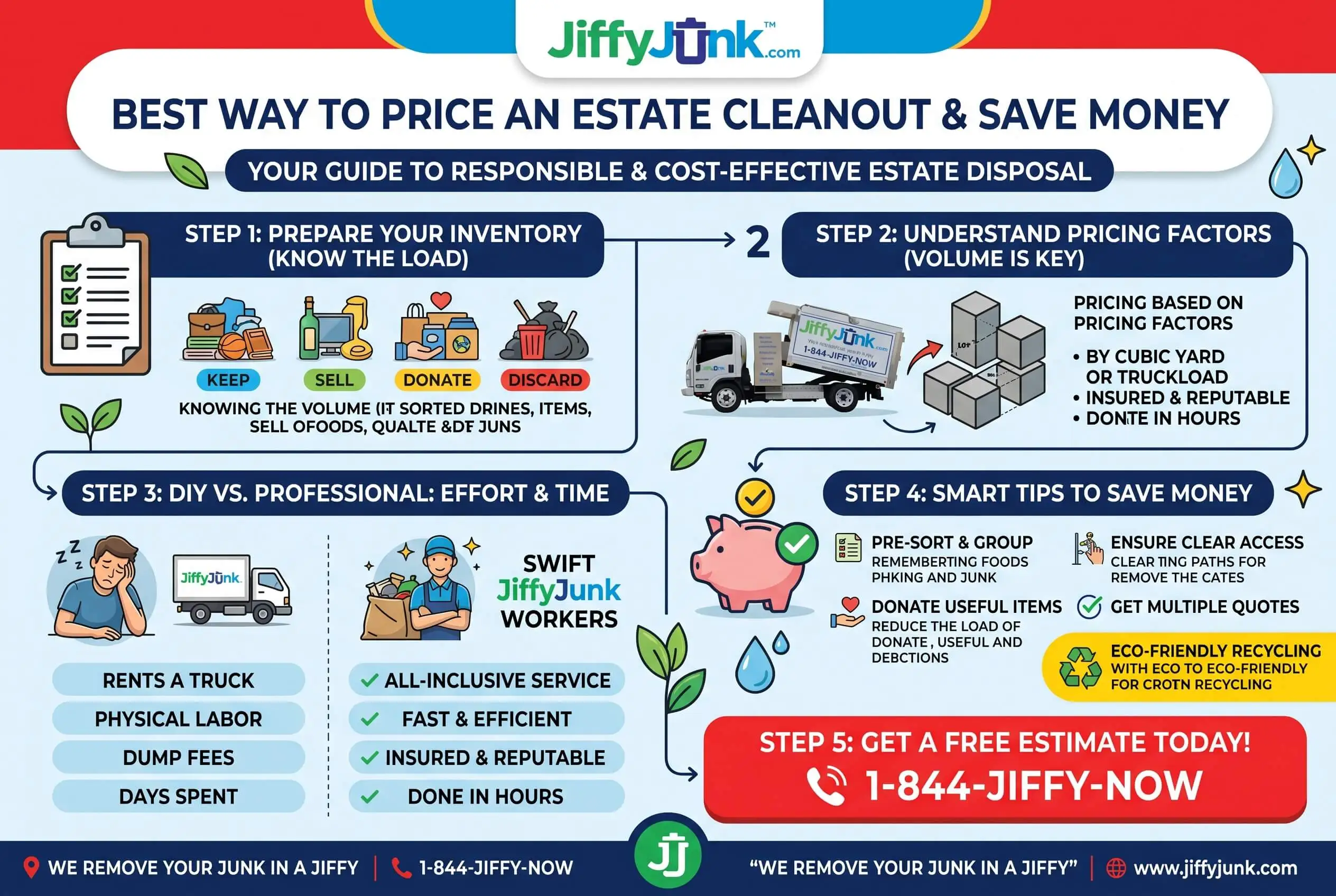For a deeper look at how reputable junk removal services structure estate and whole-house cleanout pricing, compare Jiffy Junk's detailed estate cleanout cost breakdown. The post covers exactly what an honest quote includes, which line items should never appear as a post-job surprise, the questions every family should ask during the walkthrough, and what families consistently overlook before signing.