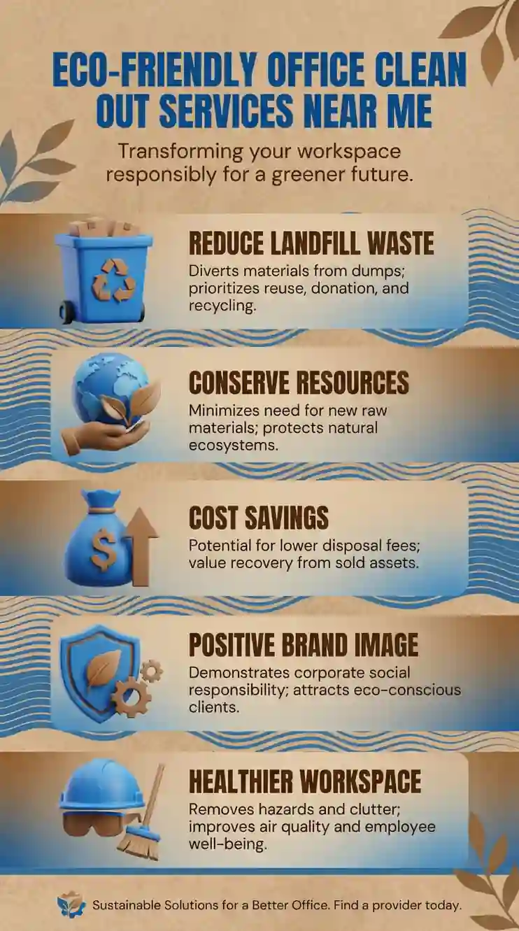 Professional office clean out services remove unwanted furniture, electronics, equipment, and debris from commercial spaces during relocations, closures, or downsizing. For eco-friendly office cleanouts, genuine environmental responsibility requires systematic donation-first coordination achieving 60-70% waste diversion through charitable partnerships, certified electronics recycling, and comprehensive documentation—not vague "we recycle everything we can" claims delivering only 15-25% diversion through basic cardboard and paper recycling.